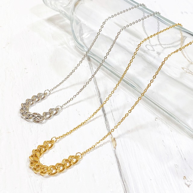 左右で異なる種類のチェーンを使用した、珍しいデザインのネックレス。 重ね付けをせずに1点でもアクセントになり、素朴でありながら目を引くアイテムです。 チェーンの長さが短いのでトップスに響かず、さり気ないオシャレ感で、年齢を問わず好感の持てるデザインとなっています。 長さ:36㎝+アジャスター5㎝ ■Stainless steelとは サージカルステンレス・316Lとも記載され、医療用のメスなどにも使用されるほど腐食や酸化、熱に強いなど優れた特性を持つステンレスです。 耐食性がとても高いので、水分やアルコールなどで、金属成分が溶け出しにくく金属アレルギーになりにくい素材です。