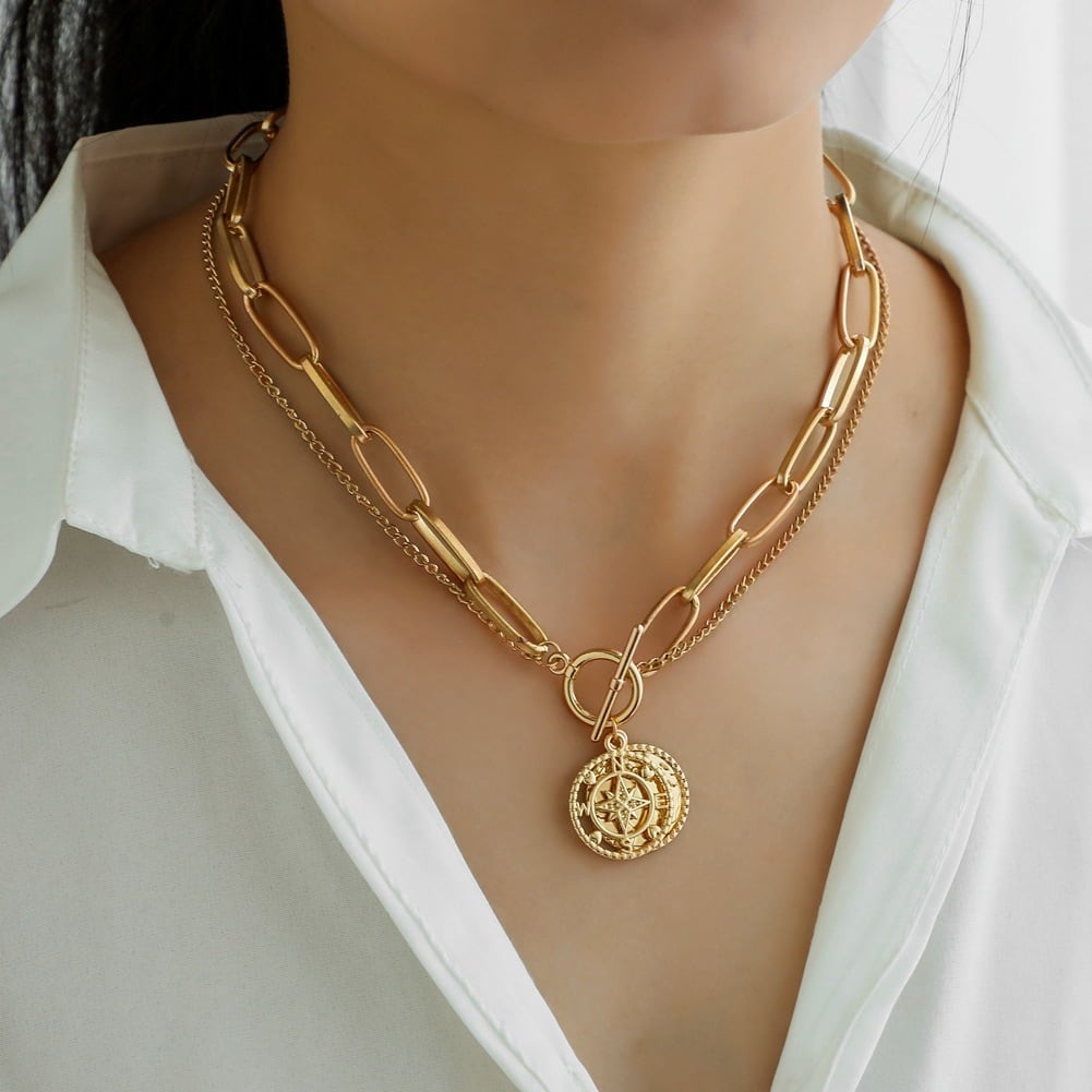 コンパスをモチーフにした、存在感のある大ぶりチェーンが付いたペンダント。