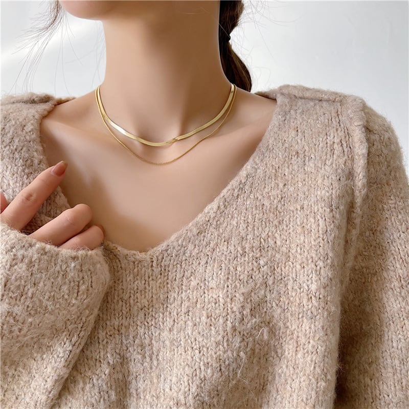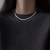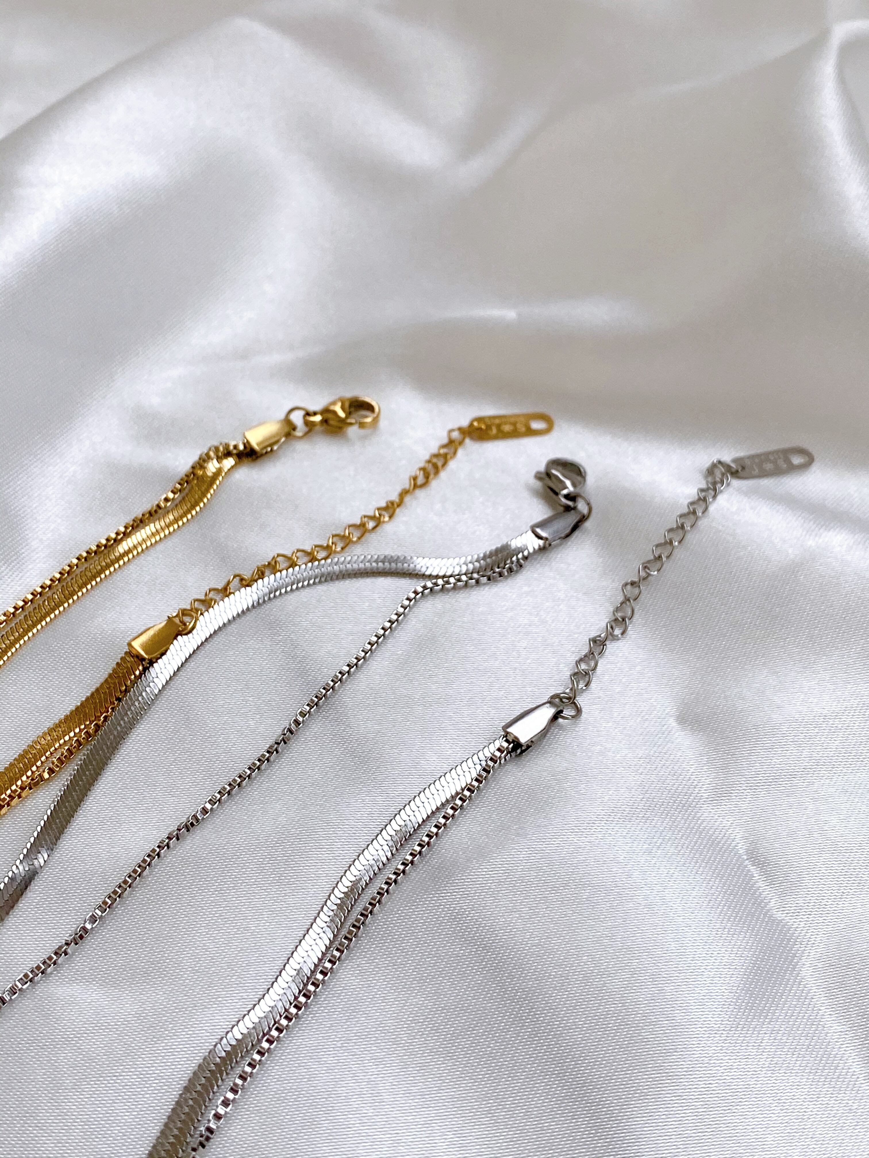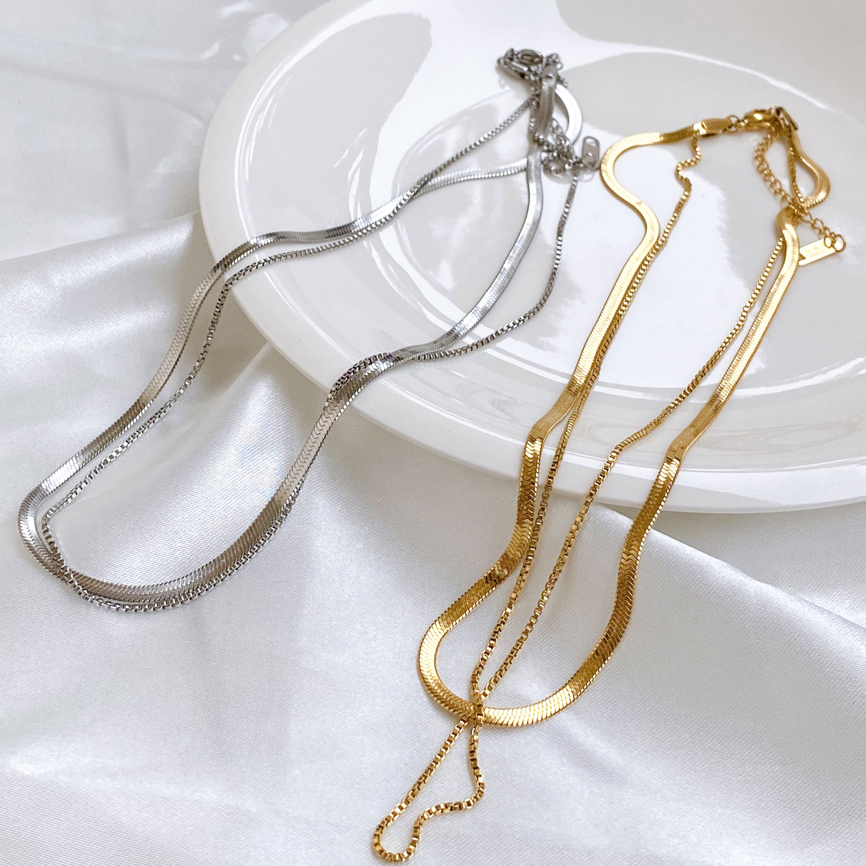 光沢感となめらかさのあるスネークチェーンと、しっかりめの印象を与えてくれるベネチアンチェーンを使用した、重ね付け風に見えるネックレス。