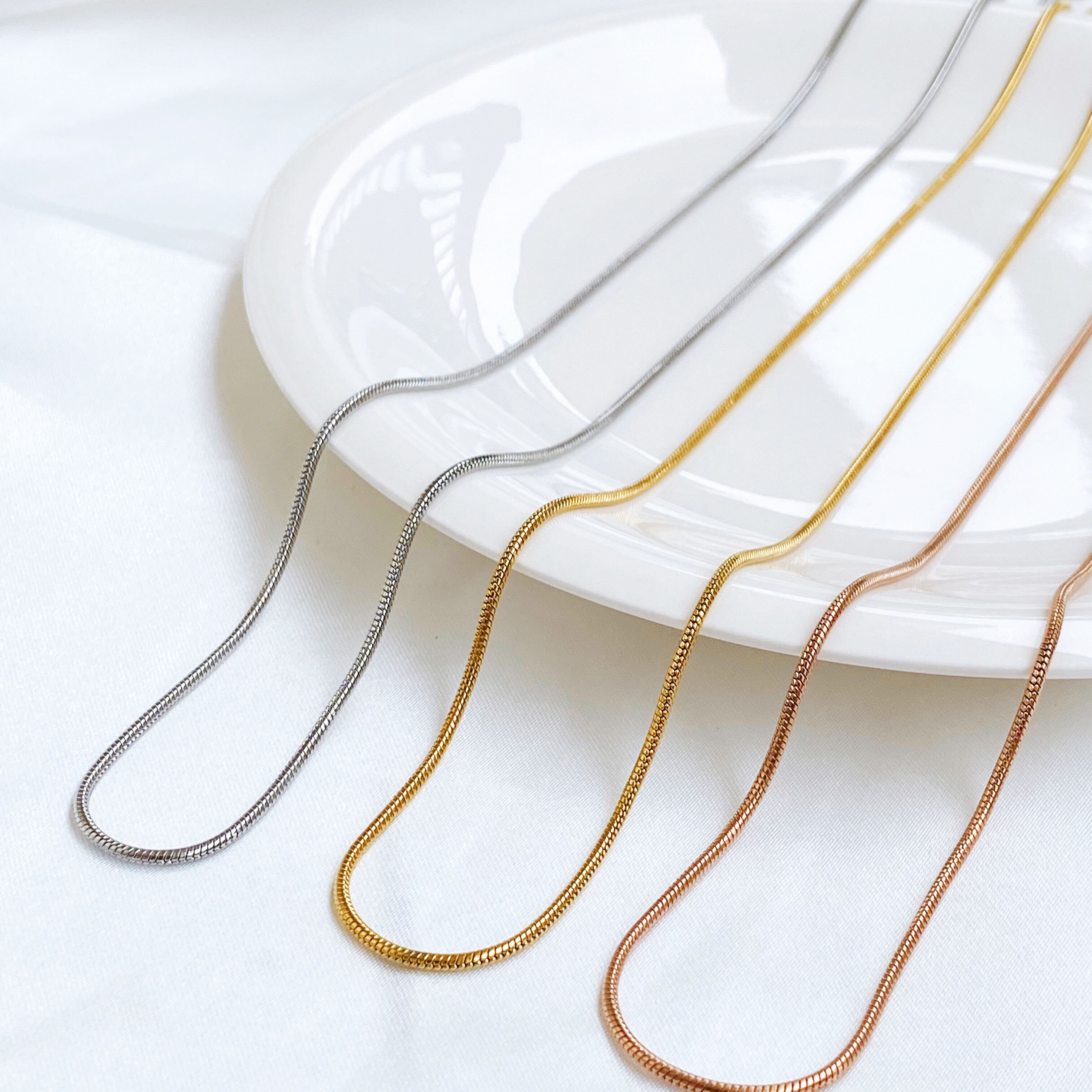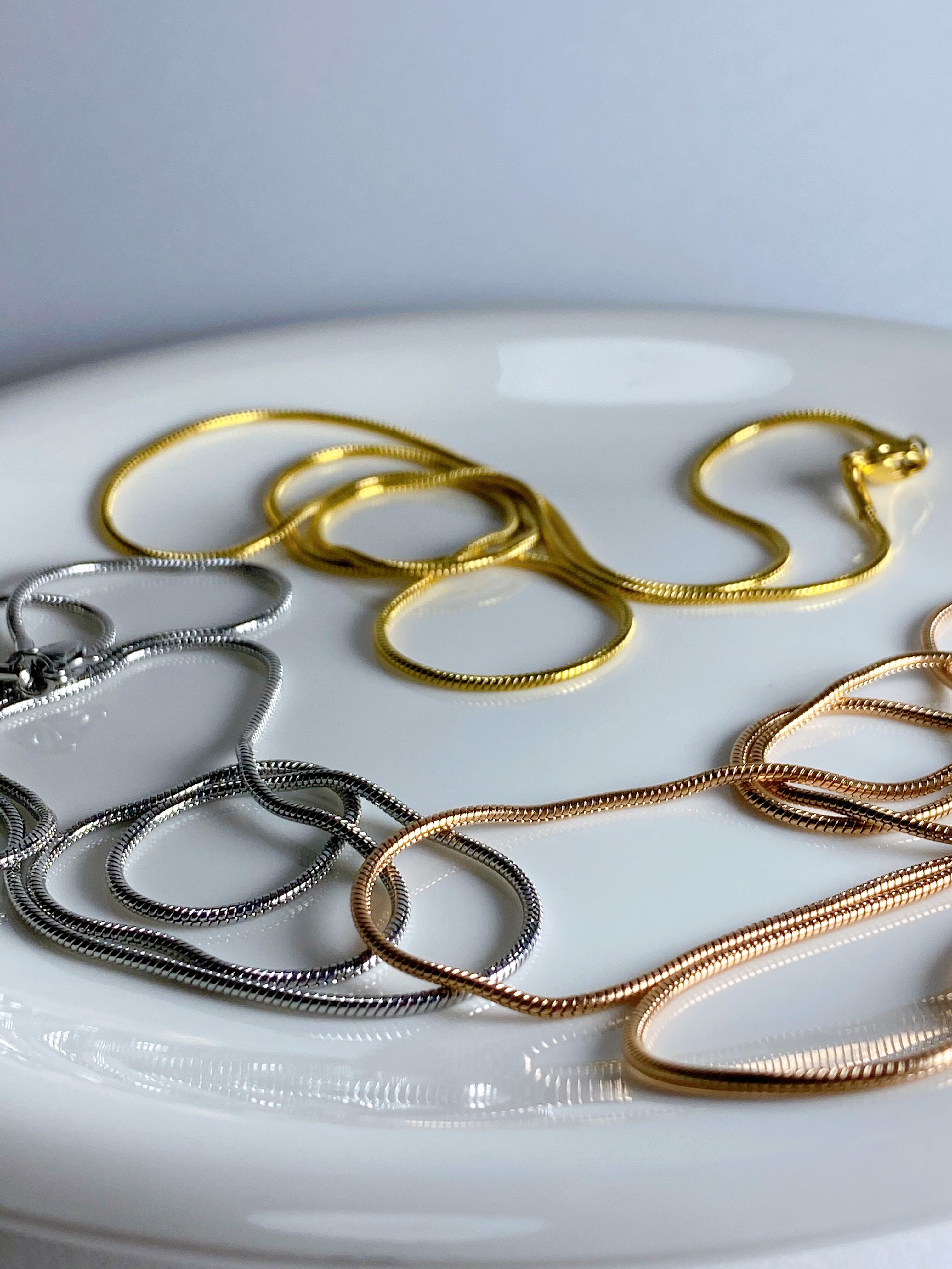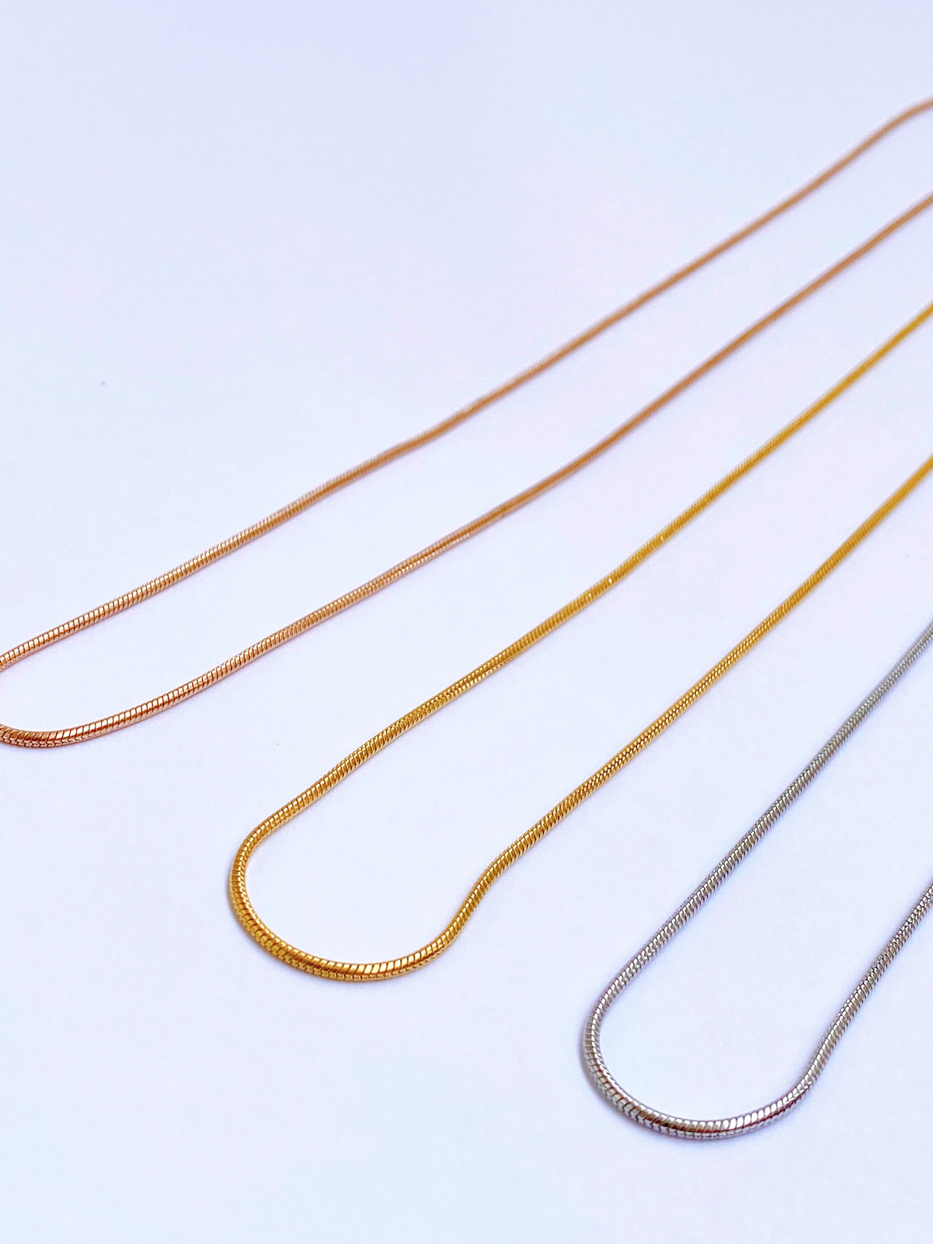3色の中から選べる、細身タイプのスネークチェーンネックレス。