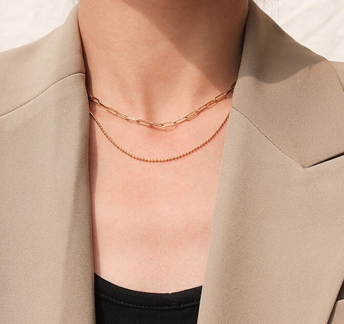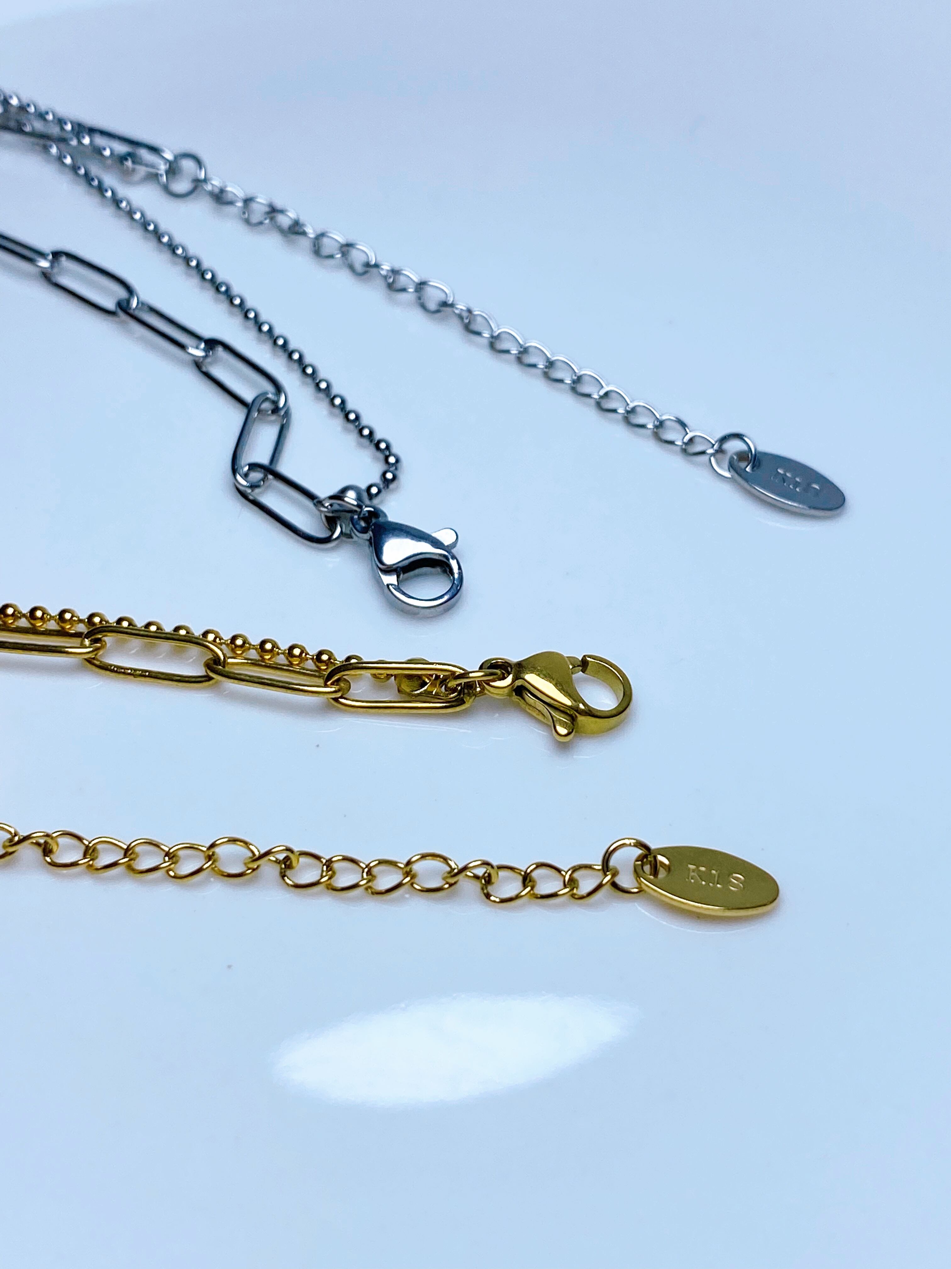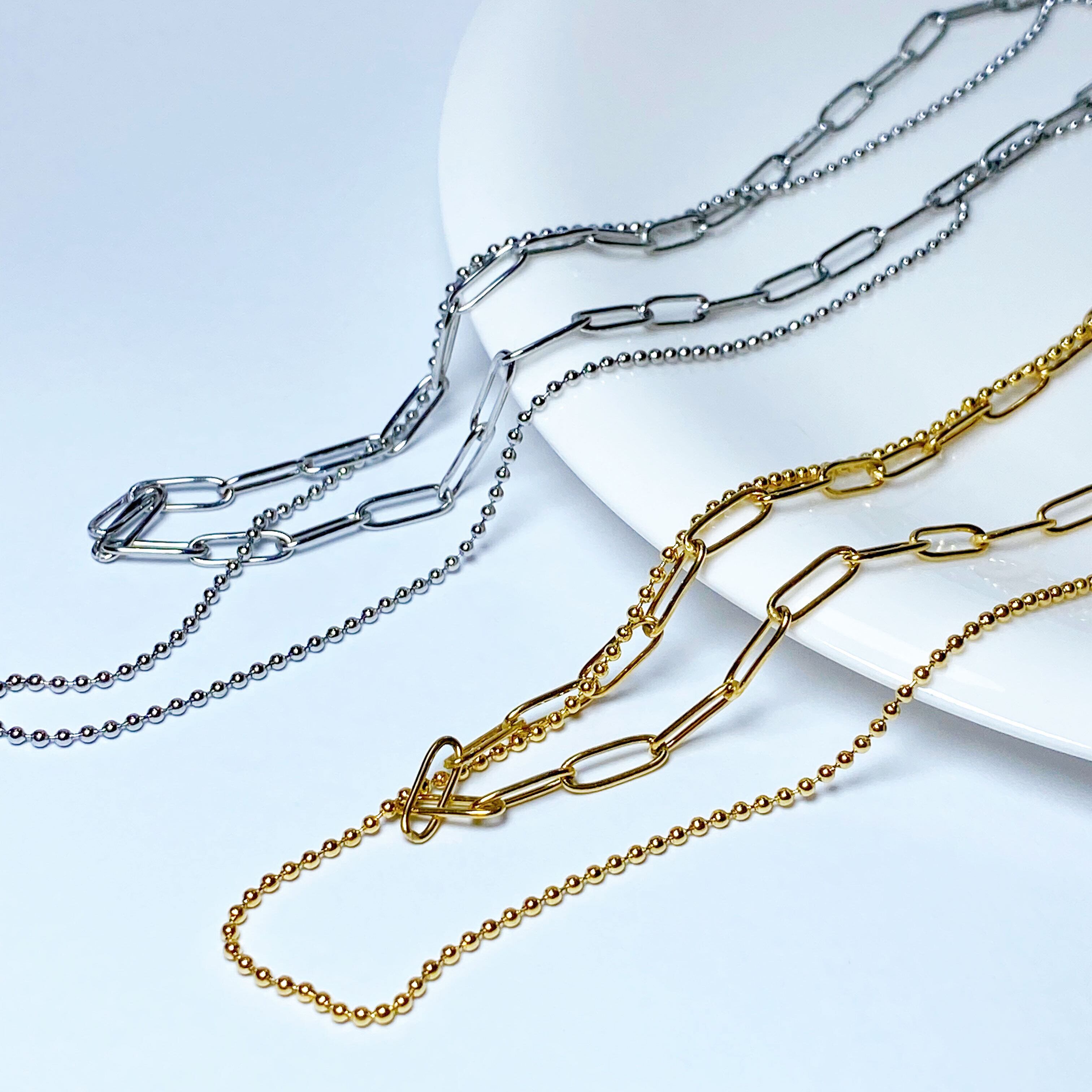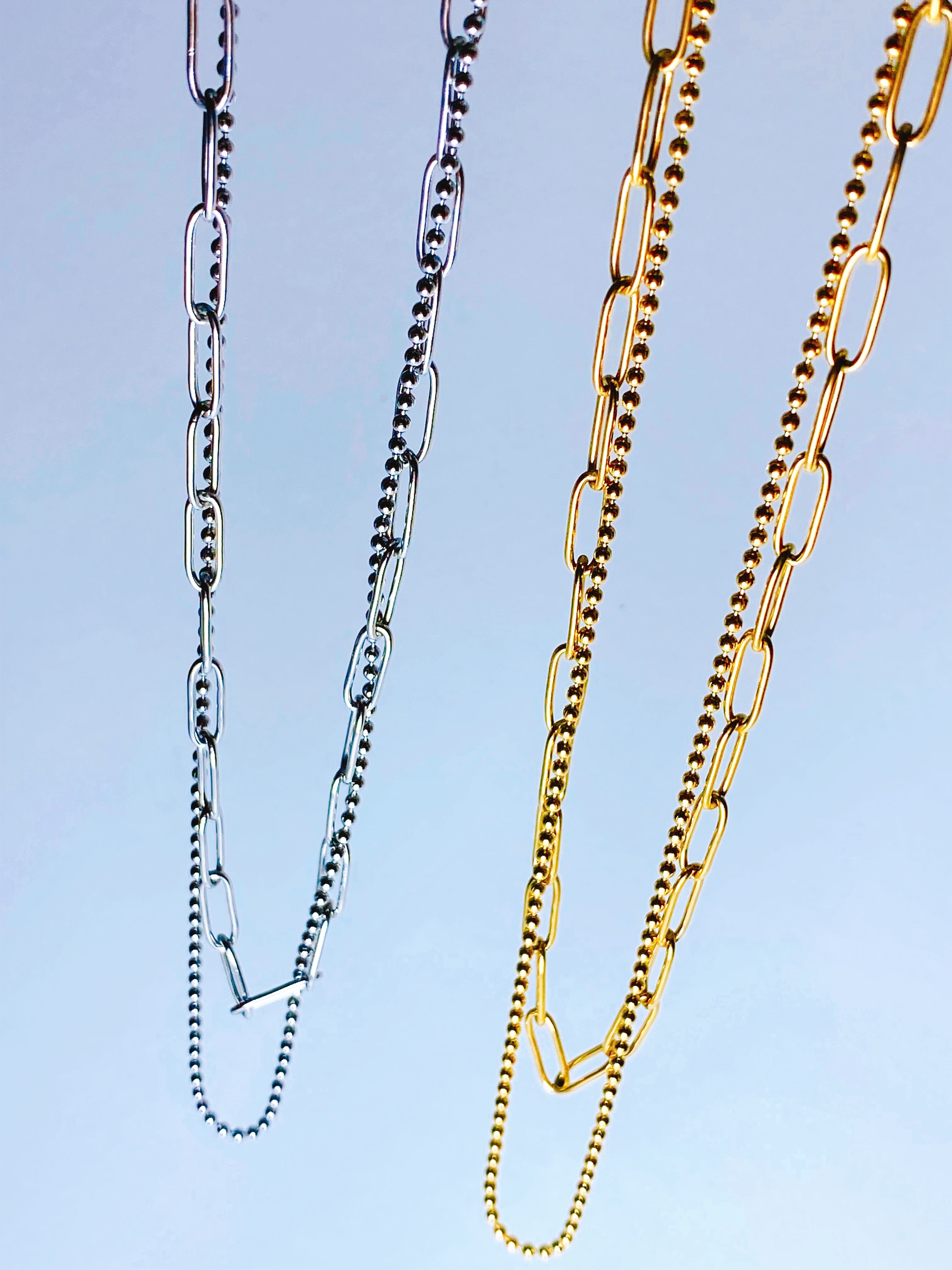 大人っぽいスクエアチェーンと、可愛らしさのあるボールチェーンをMIXさせた、2種類分のデザインが楽しめる欲張りネックレス。