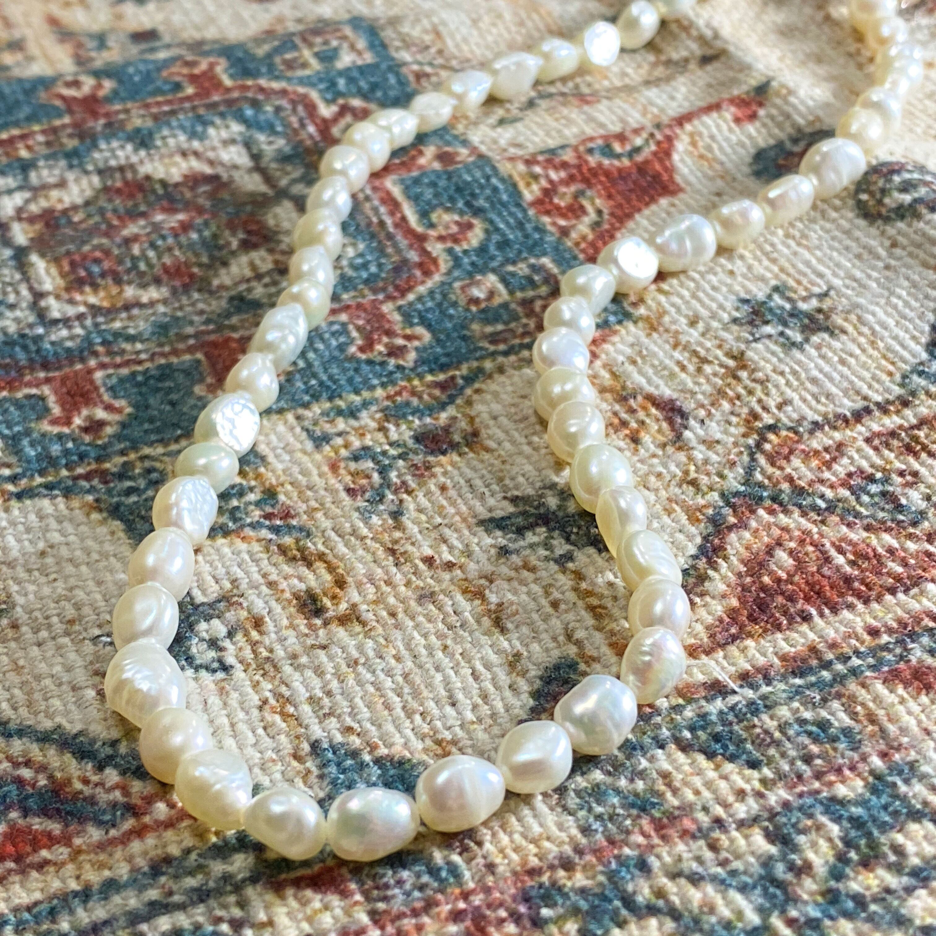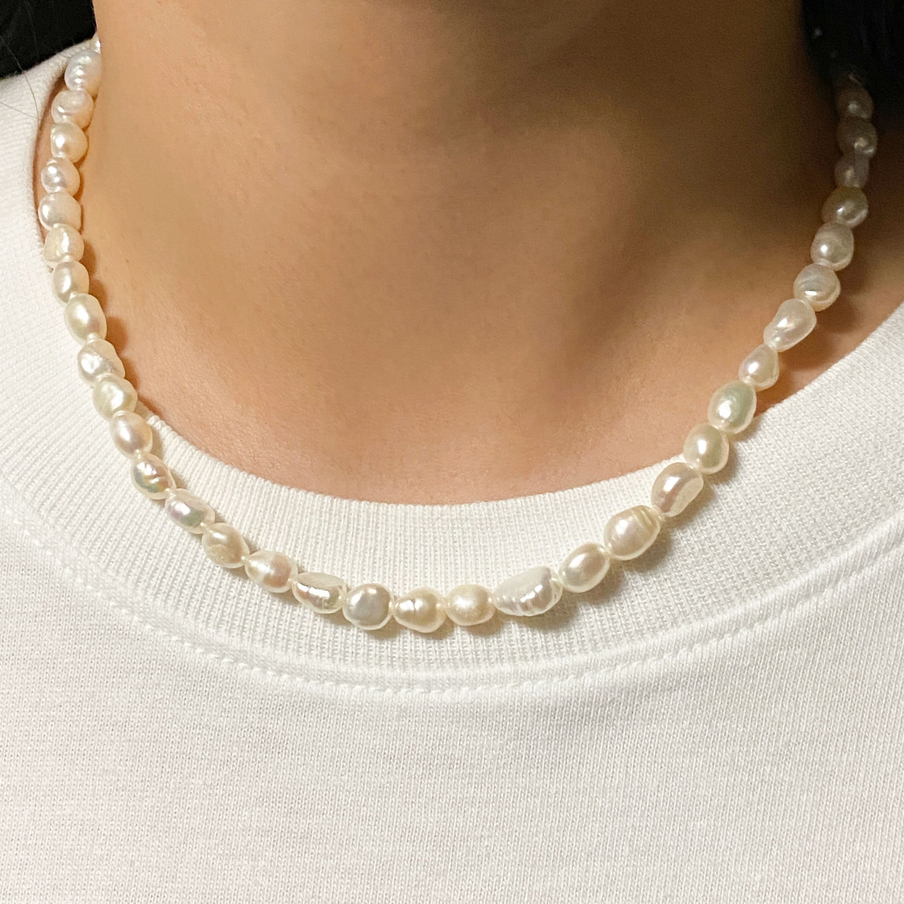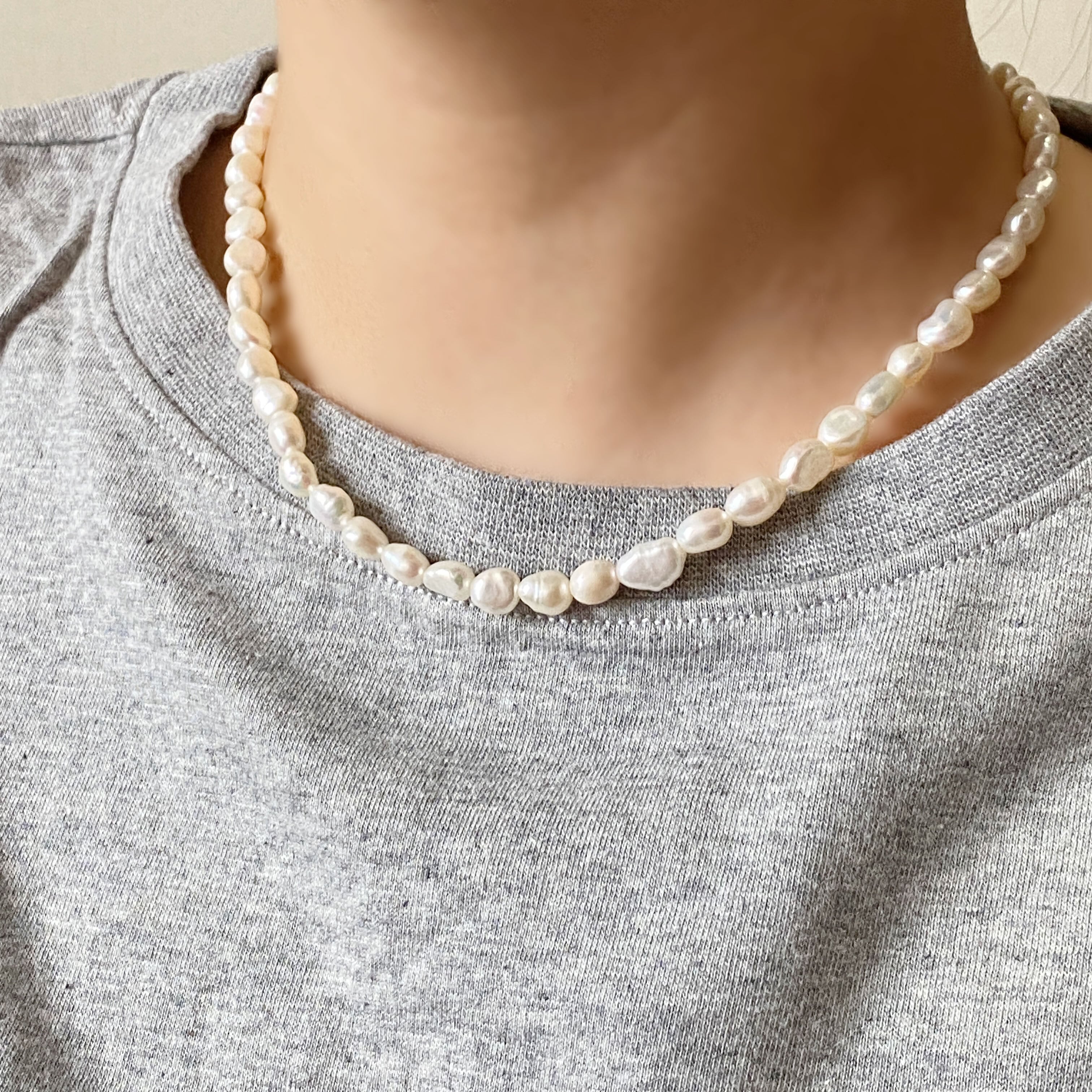 お肌を明るく見せてくれるホワイトの淡水パールネックレス。