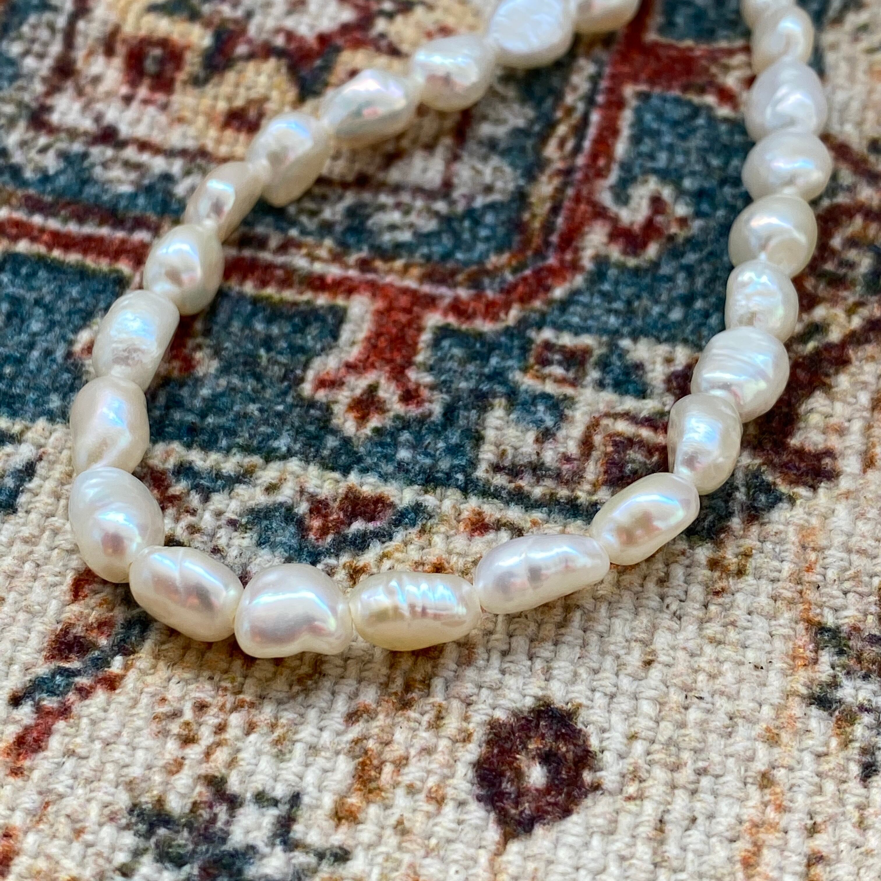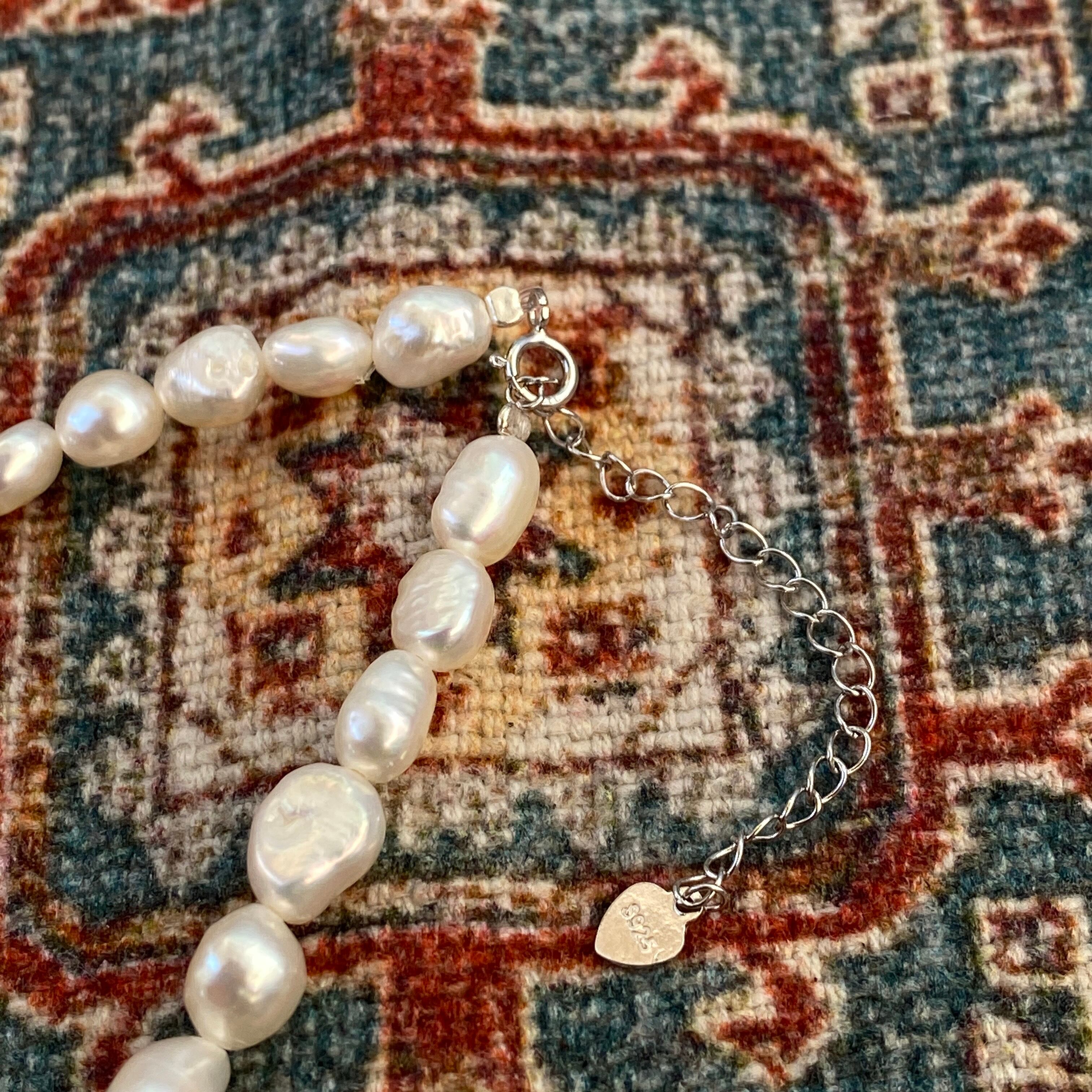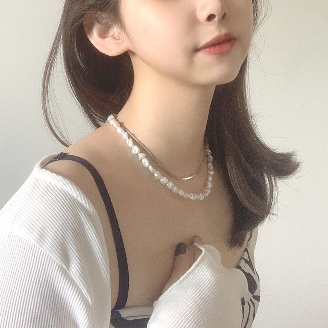 お肌を明るく見せてくれるホワイトの淡水パールネックレス。