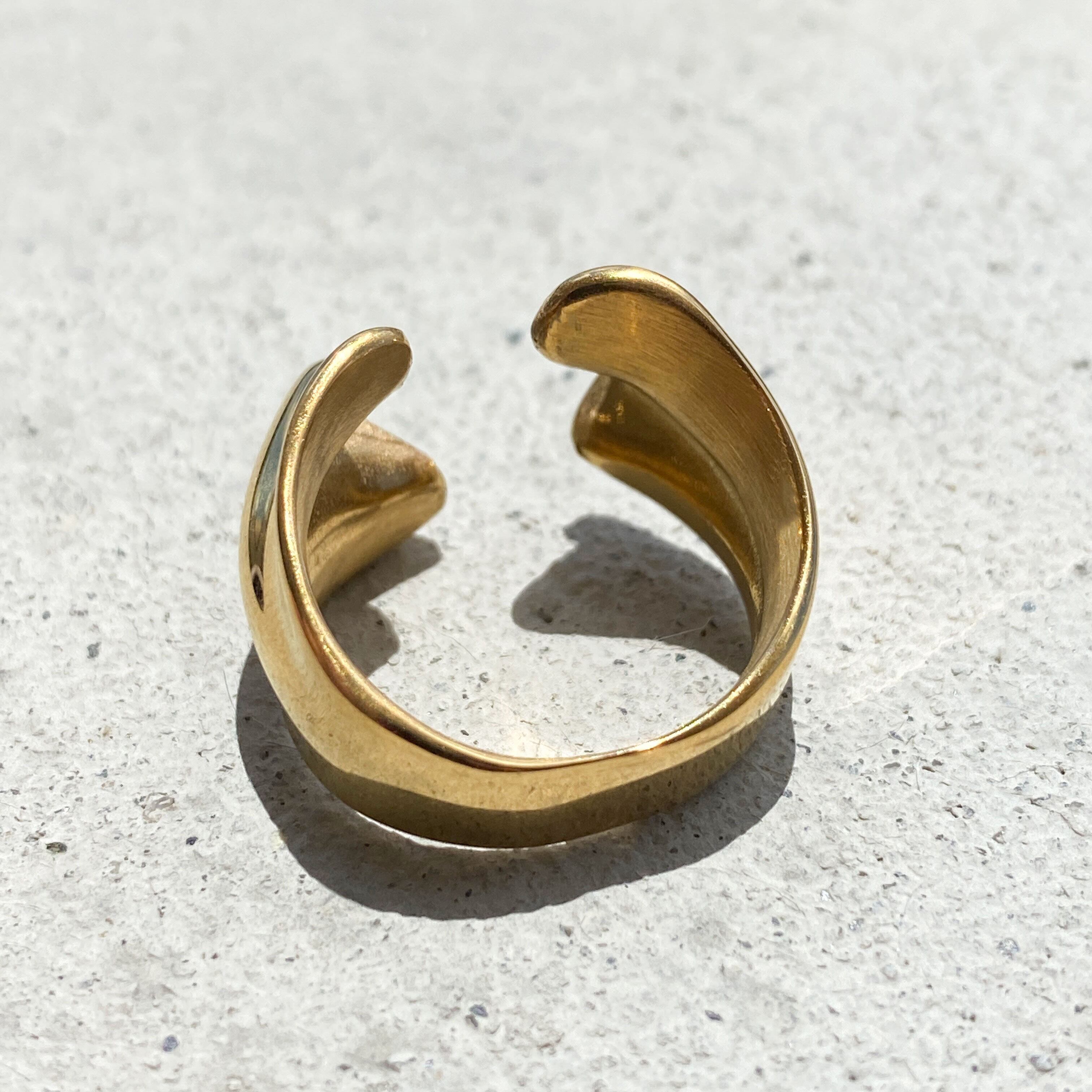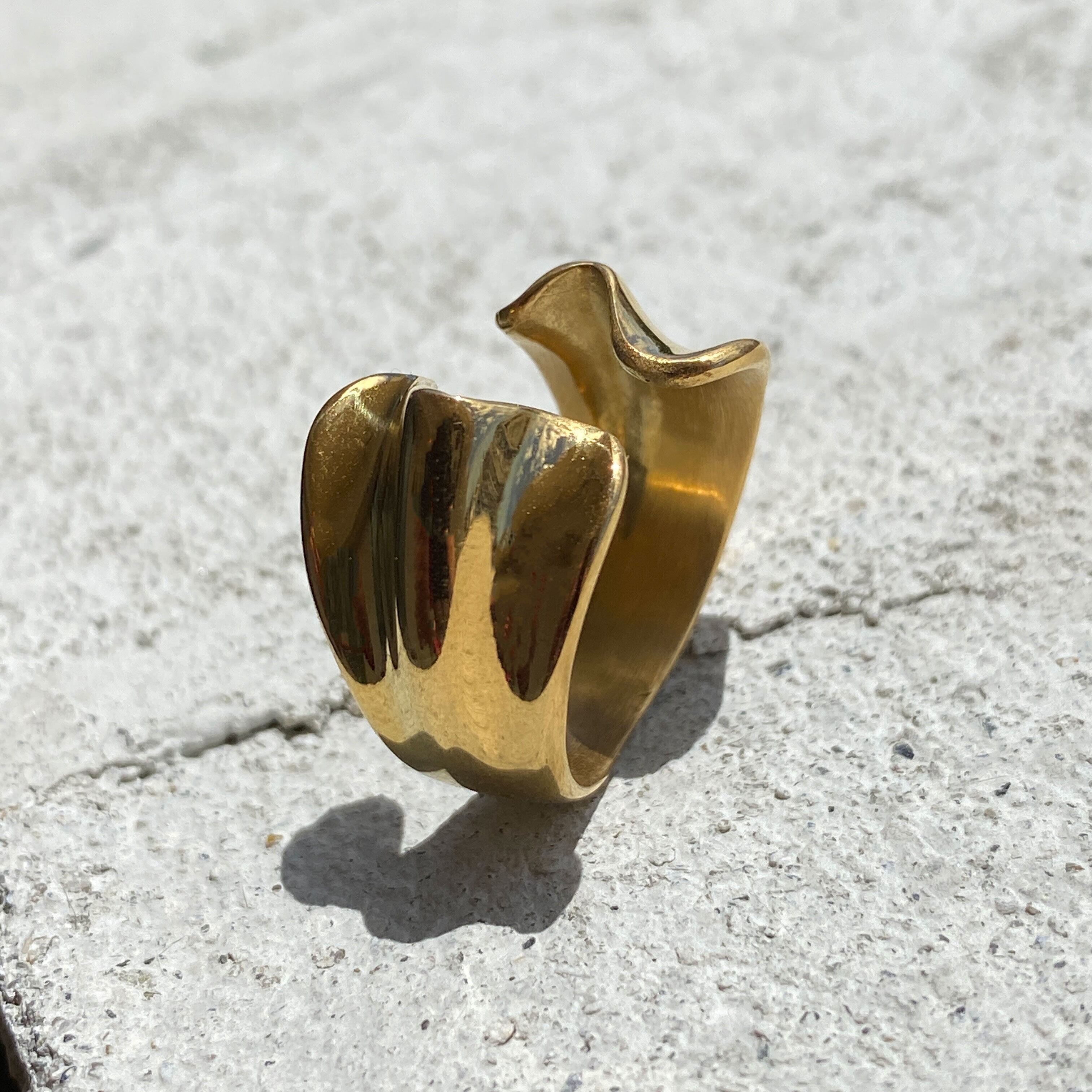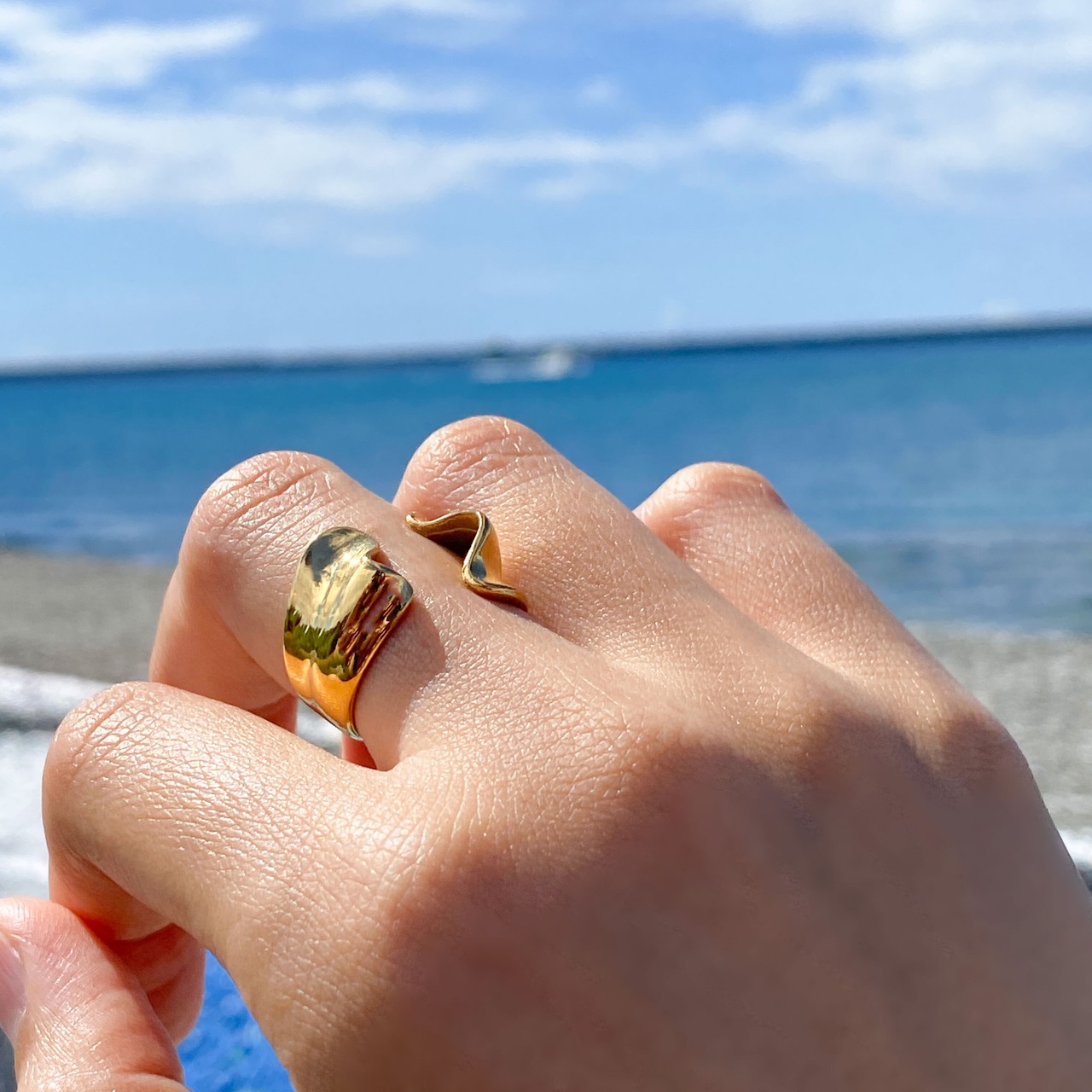 波打つ海のようなデザインで、他にはない魅力を感じさせてくれるゴールドカラーのリング。