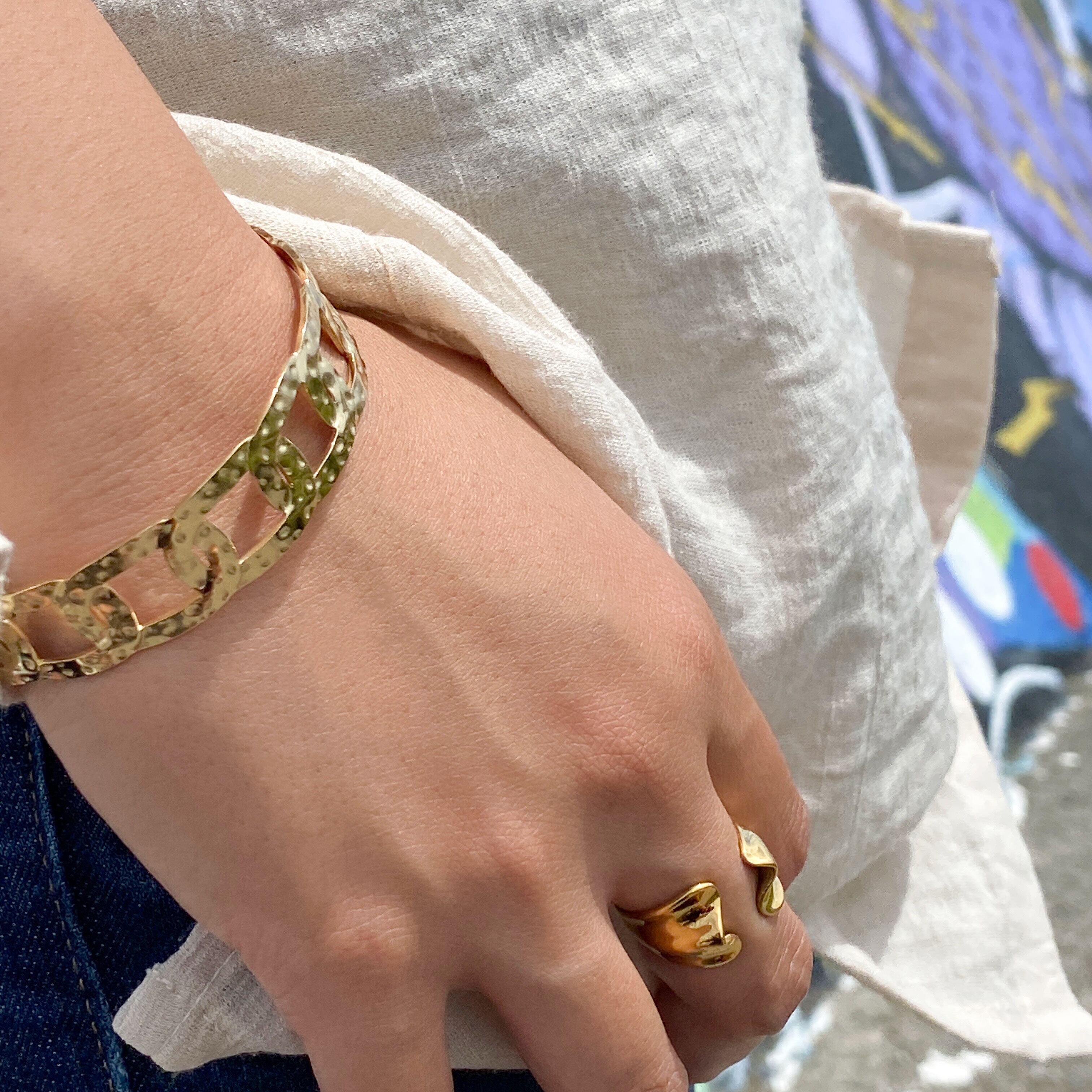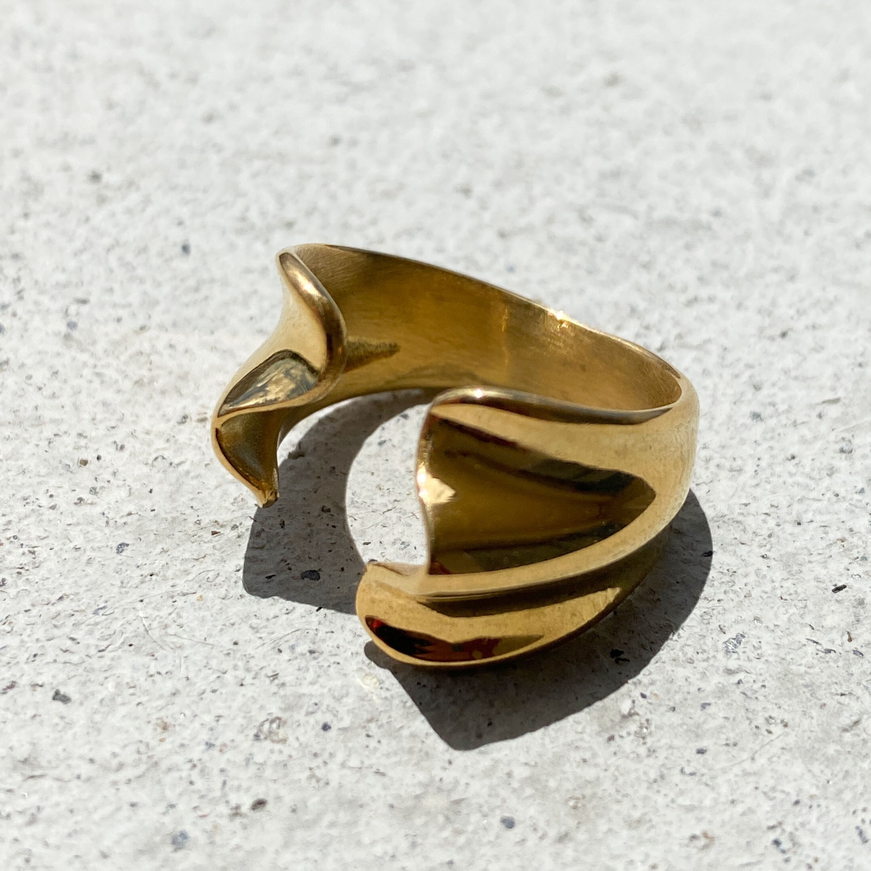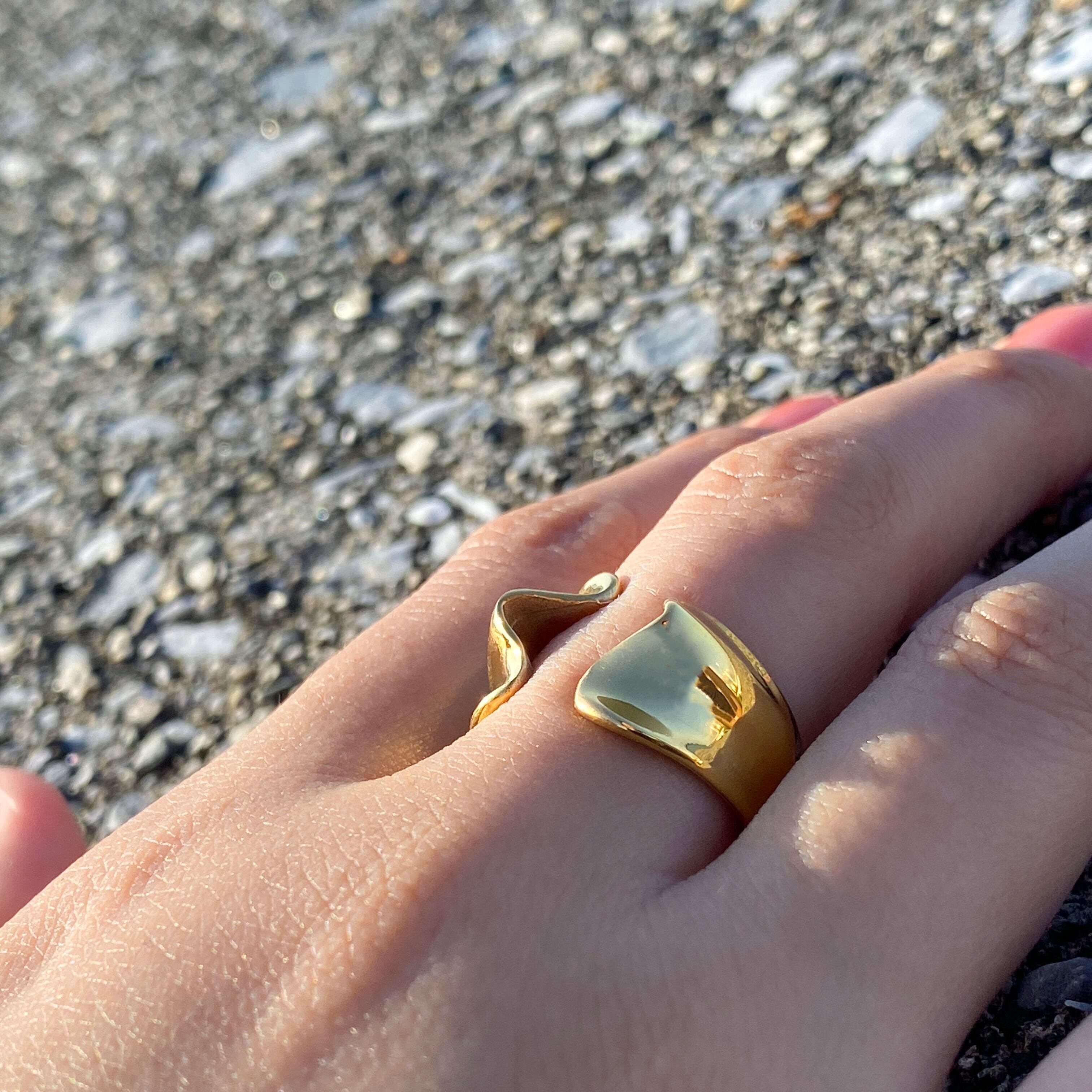 波打つ海のようなデザインで、他にはない魅力を感じさせてくれるゴールドカラーのリング。